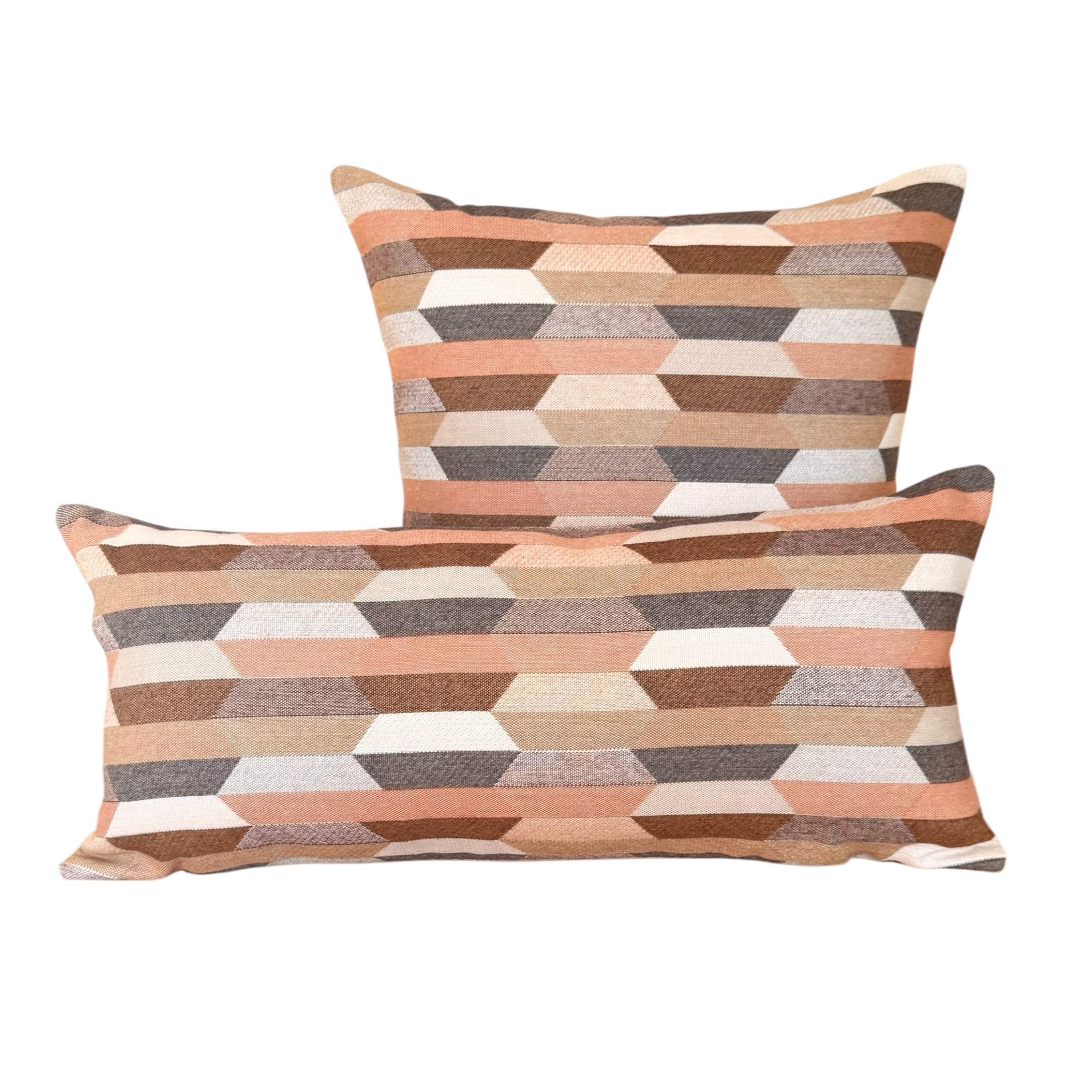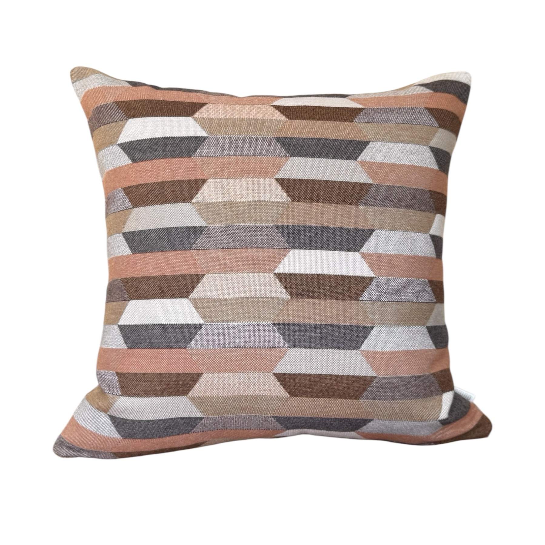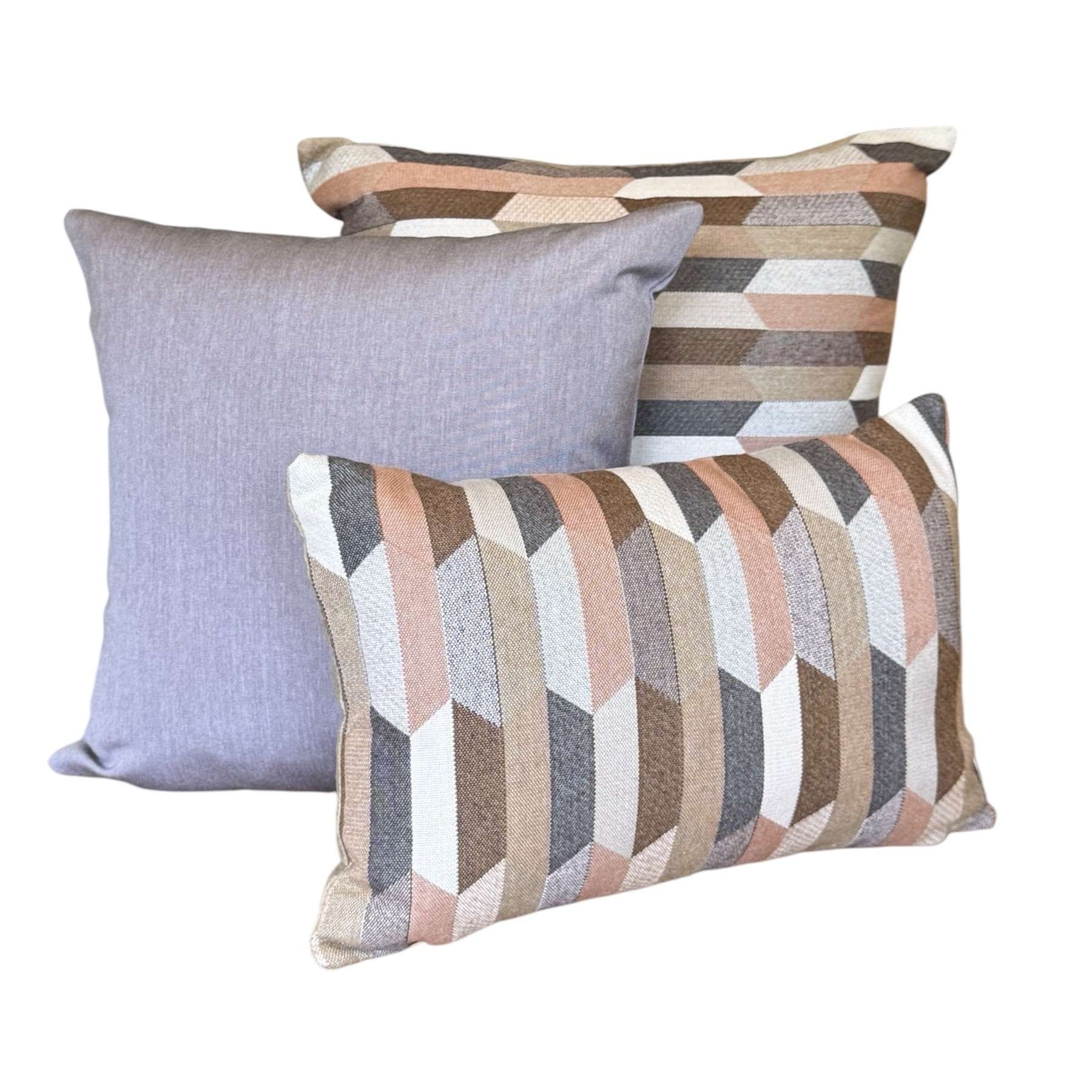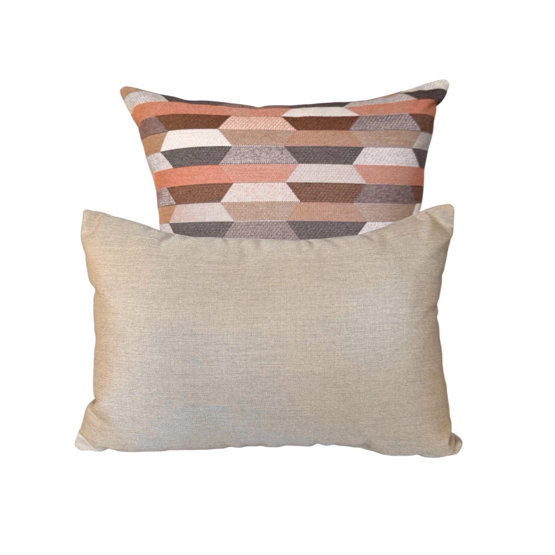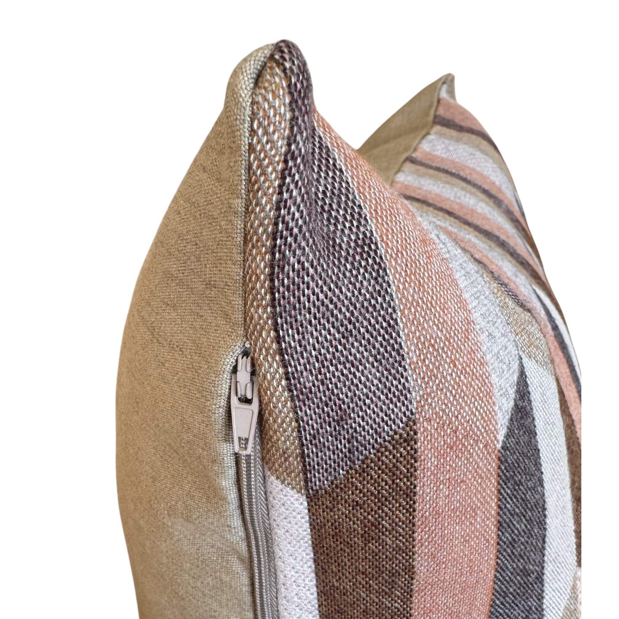 Santa-Fe Beige is a multi coloured Aztec patterned front with colours of Camel, Teak, Salmon, Peach, Blush and Dusk-Mauve with a Heather Beige Sunbrella 100% solution dyed acrylic canvas back outdoor cushion cover.