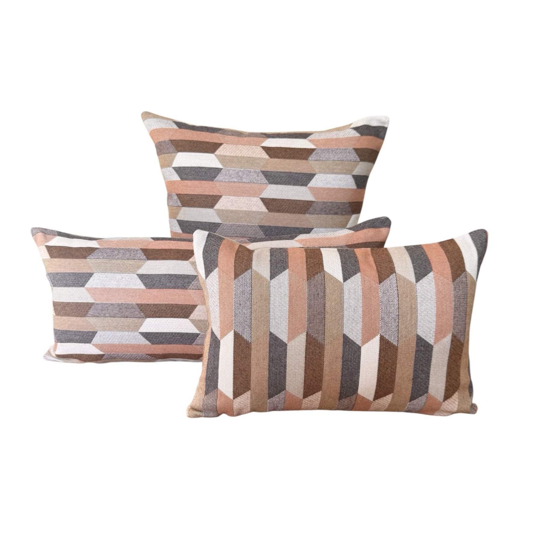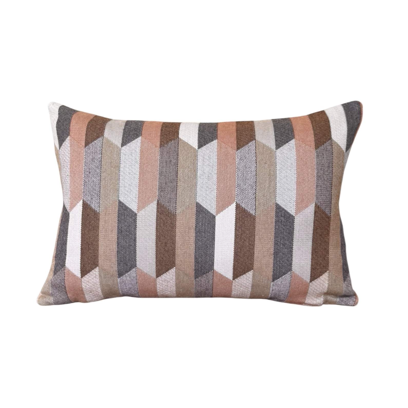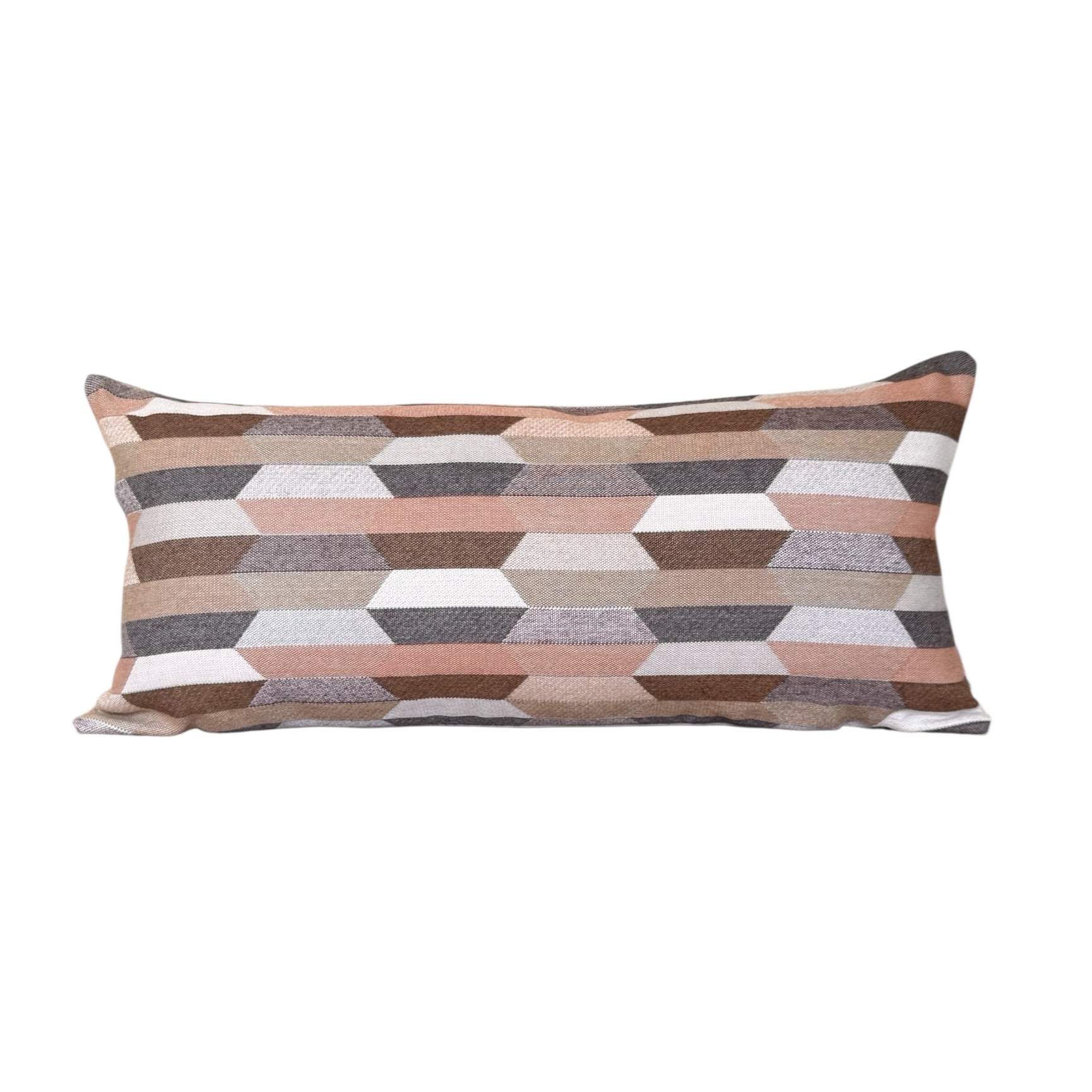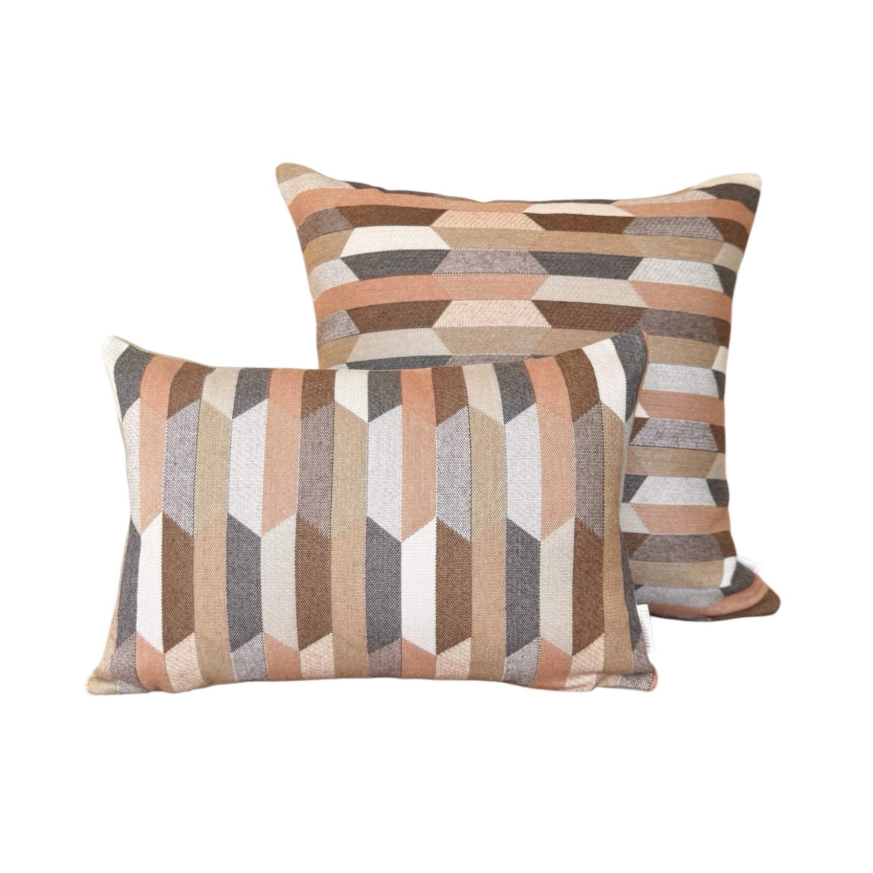 Santa-Fe Beige is a multi coloured Aztec patterned front with colours of Camel, Teak, Salmon, Peach, Blush and Dusk-Mauve with a Heather Beige Sunbrella 100% solution dyed acrylic canvas back outdoor cushion cover.