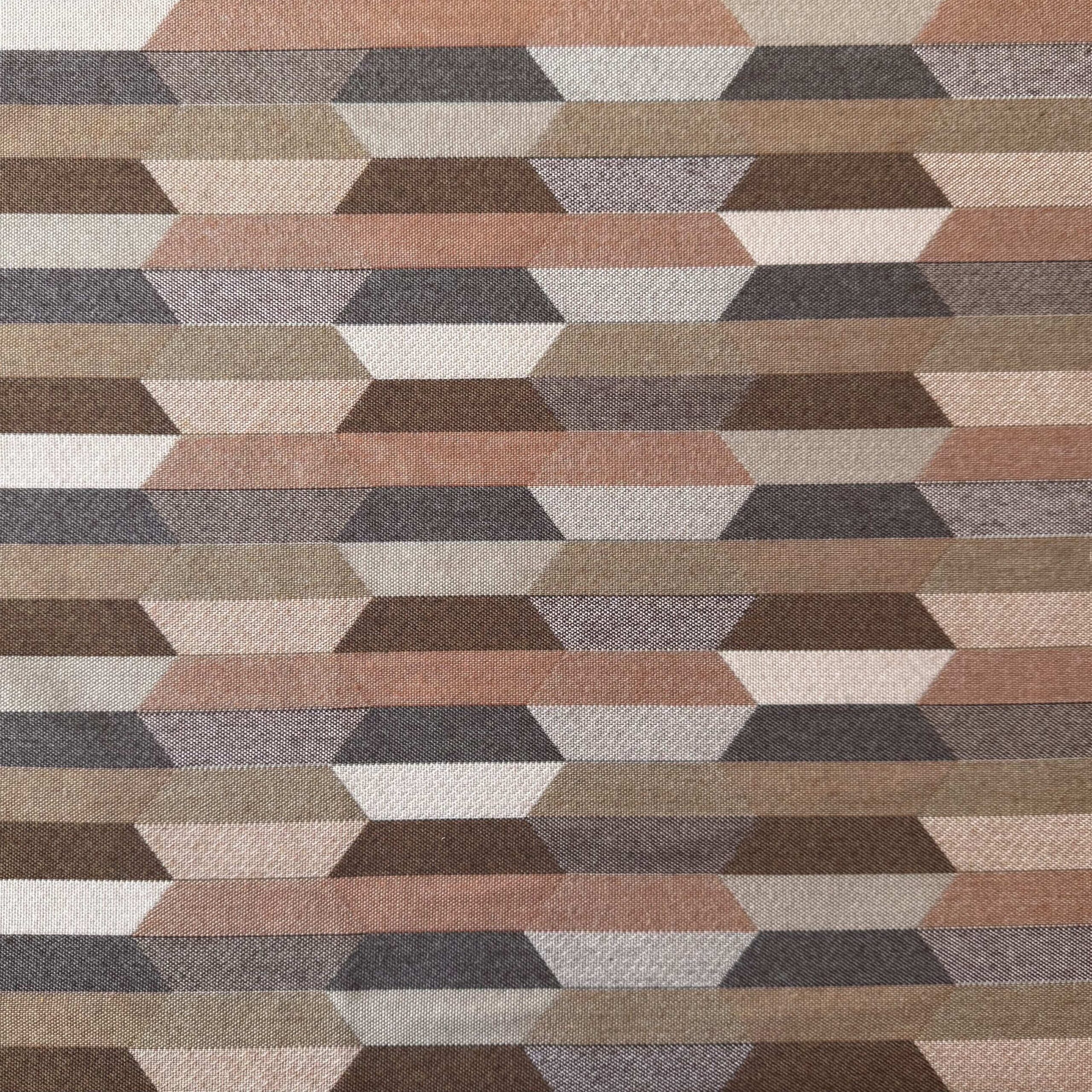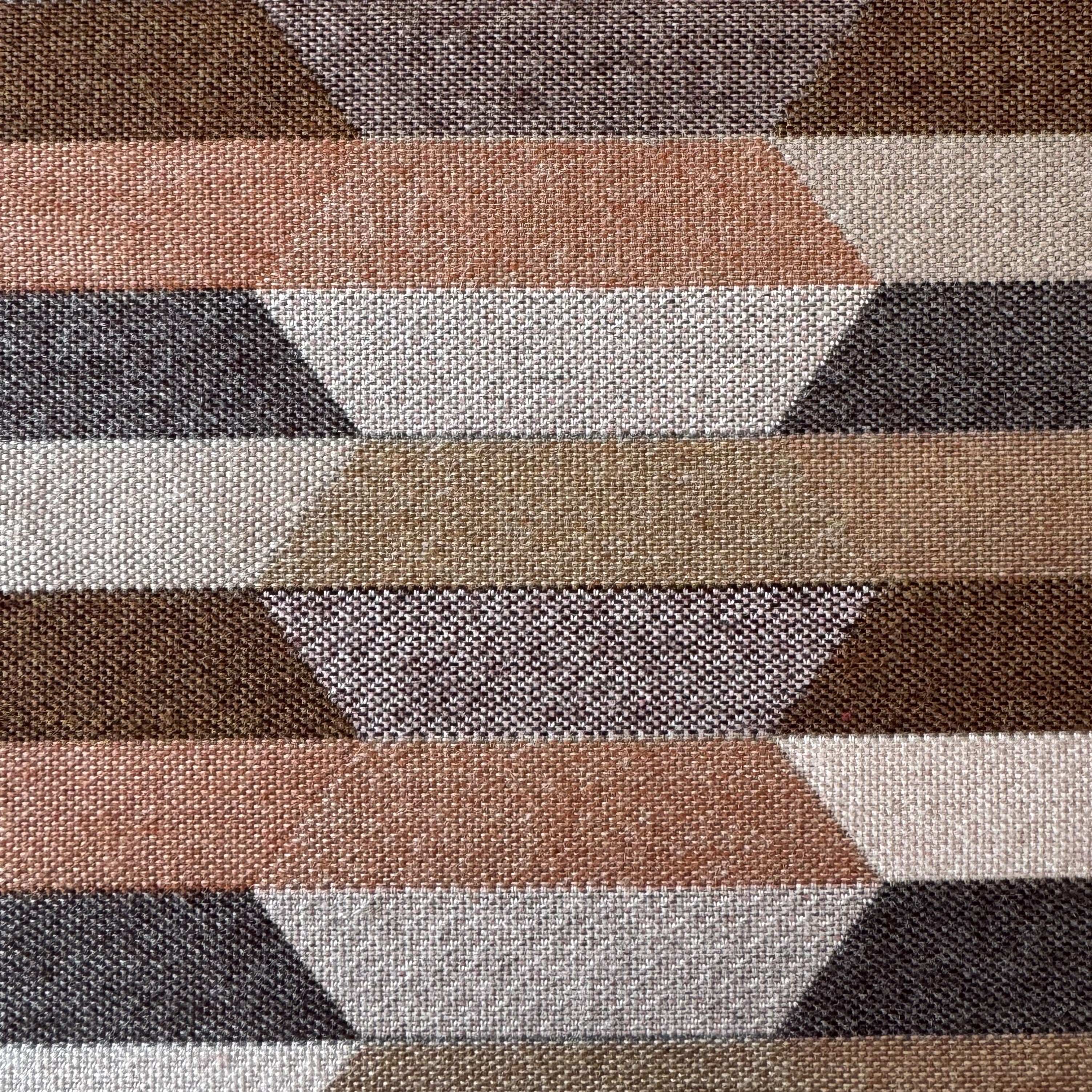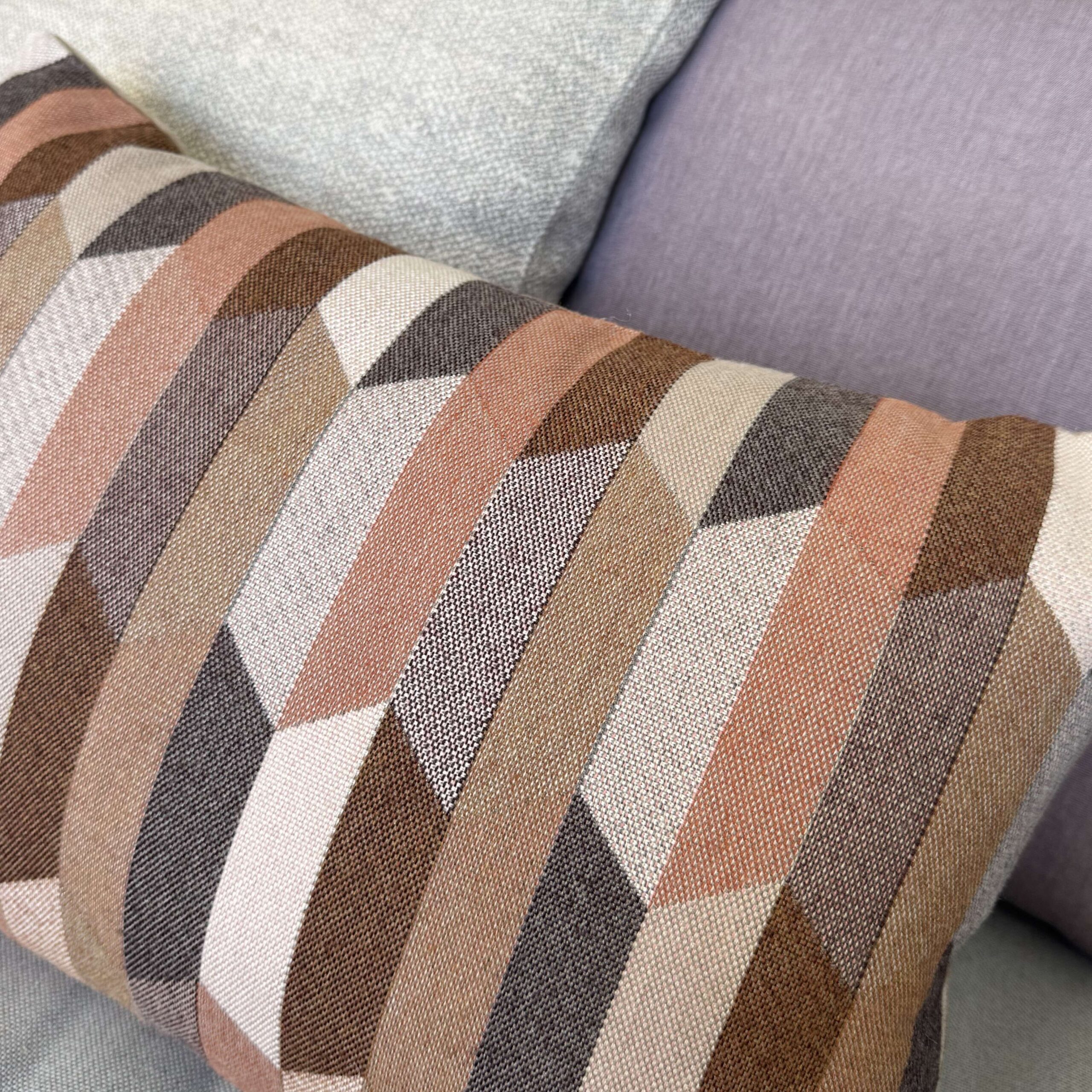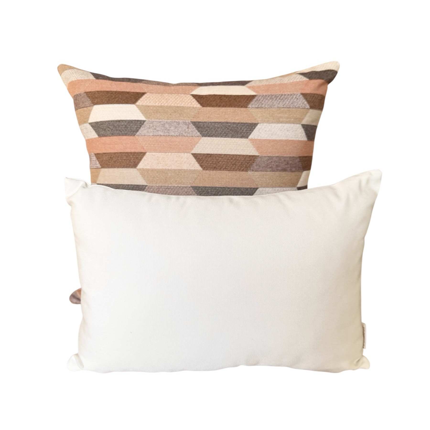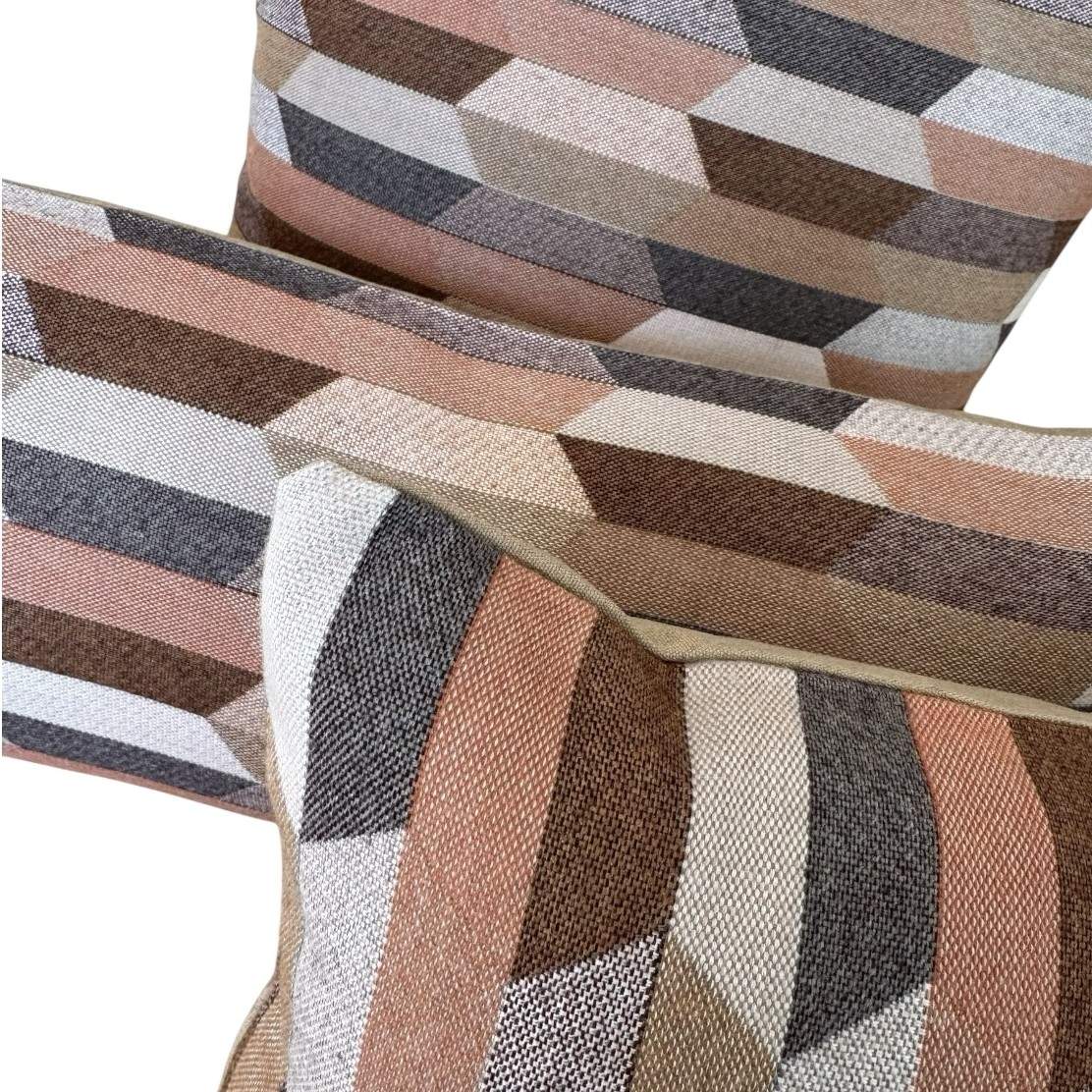 Santa-Fe Beige is a multi coloured Aztec patterned front with colours of Camel, Teak, Salmon, Peach, Blush and Dusk-Mauve with a Heather Beige Sunbrella 100% solution dyed acrylic canvas back outdoor cushion cover.